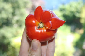 The late-summer tomatoes are in full swing! So far, most are red, spherical and a little smaller than fist-sized; this one was more interesting.